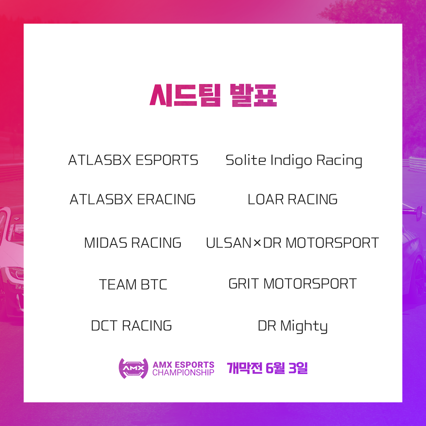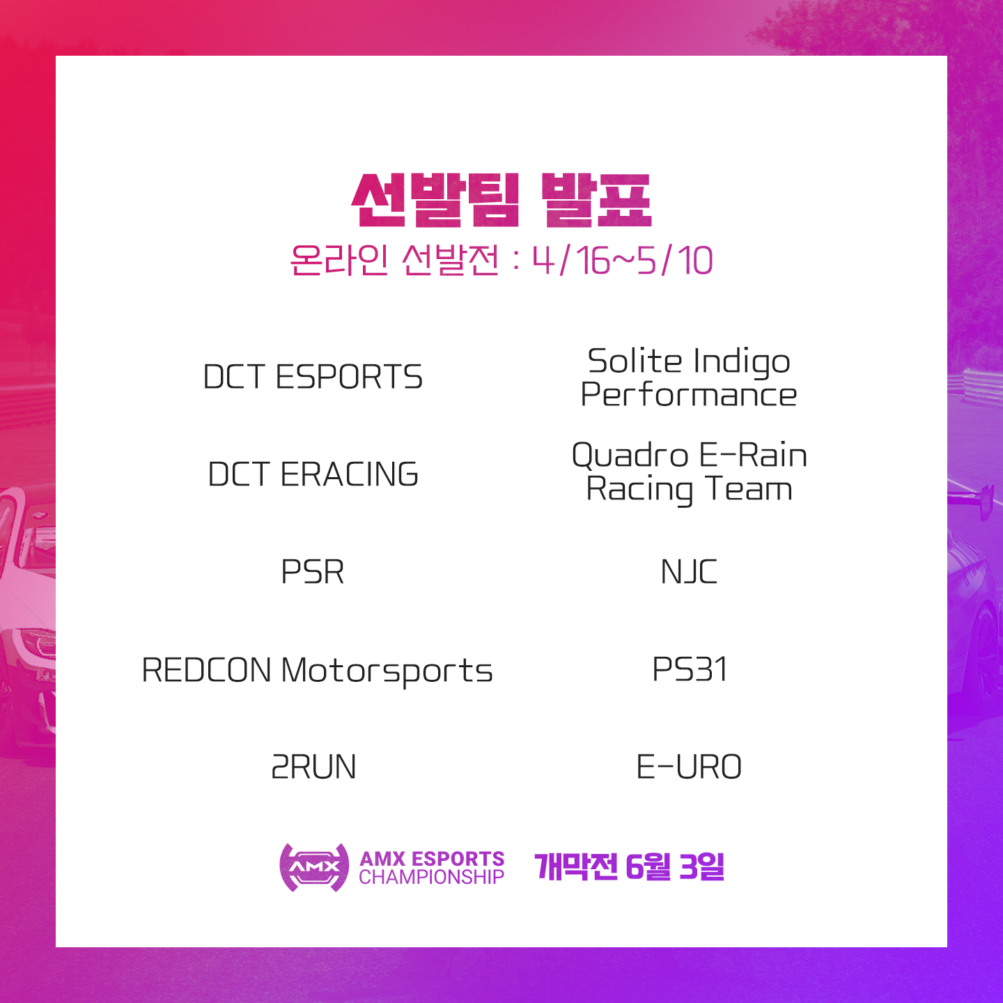 시드팀 10팀, 선발팀 10팀으로 구성된 <AMX e스포츠 챔피언십> 본선 개막전은 6/3(목) 시작됩니다.